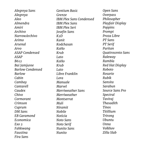 We included a very specific subset of fonts, because not all fonts are created equal. All the typefaces had to have at least four fonts: regular, bold, italic, and bold italic.With about 1000 typefaces to choose from, this narrows the range down considerably. Then, the font must include all the normal expected special characters and they have to be usable. Some fonts have special characters that look like they were borrowed from the left-over parts bin and don’t work well at all. Nothing is more frustrating for a designer who is setting type to have chosen a typeface, found a good typeface to pair with it after some time and effort only to be halfway through some project and realize there’s no em-dash, or to see an ampersand borrowed from some other font like Times or Arial, or not have a proper bullet or caret. We’ve made sure all the typefaces have those characters so you’ll never be left wondering! Typefaces used in the Preposterously Huge Book of Google Font Combinations that meet these specific and strict criteria include: