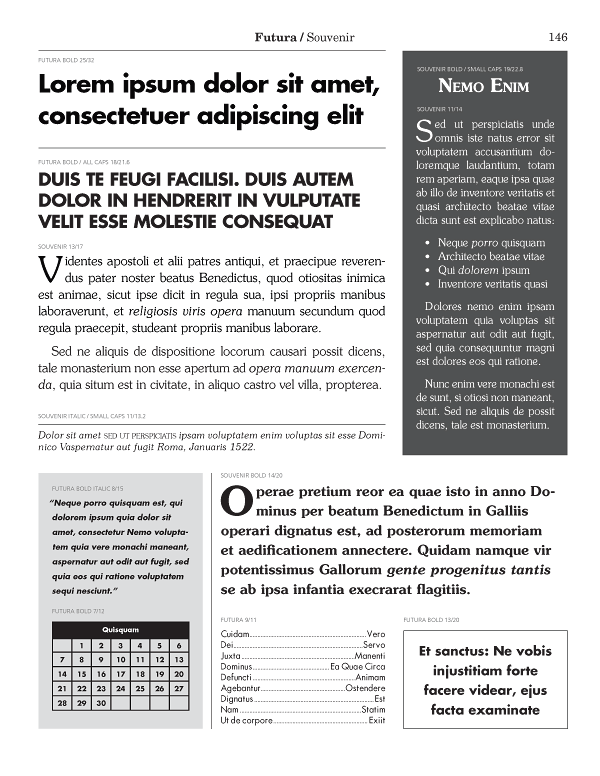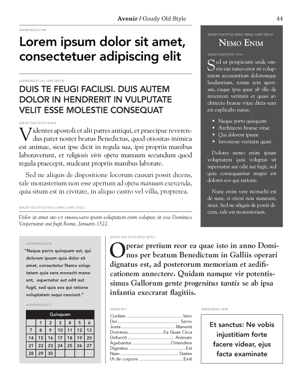 See the previous question for more detail. In a nutshell, we needed to cram a lot, but not too much, and not too little information on each page of pairings combinations. Yes, there is a lot going on. No, you don’t want to emulate this layout for your next newsletter. But yes, you get a wide variety of practical ideas for each font and each page, all without having to fiddle with any software. Think of it like a sketchbook for ideas, and you’ll have a perfect understanding of the layout.