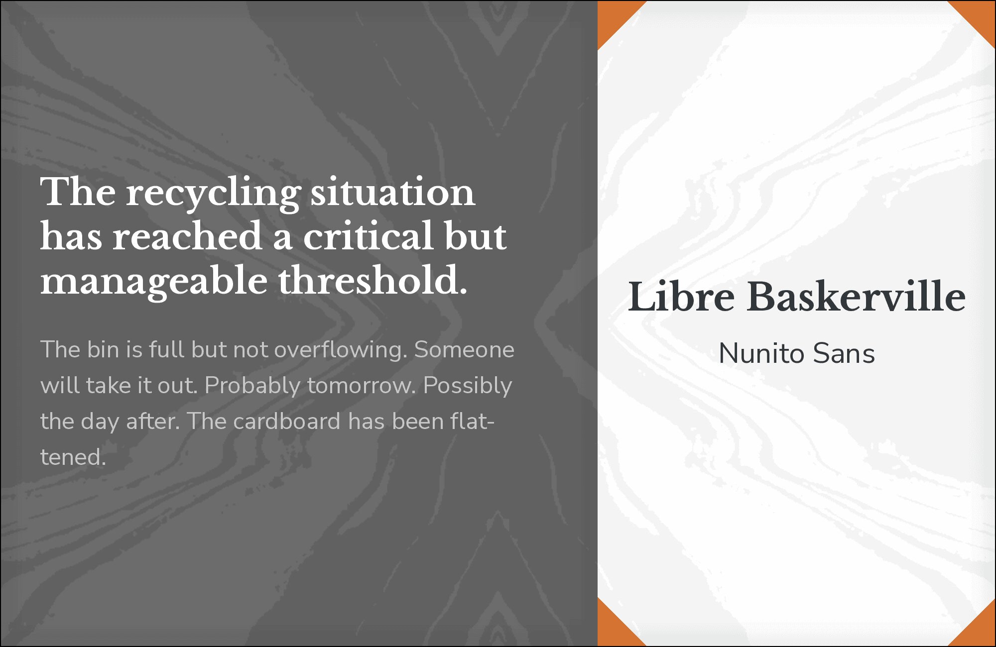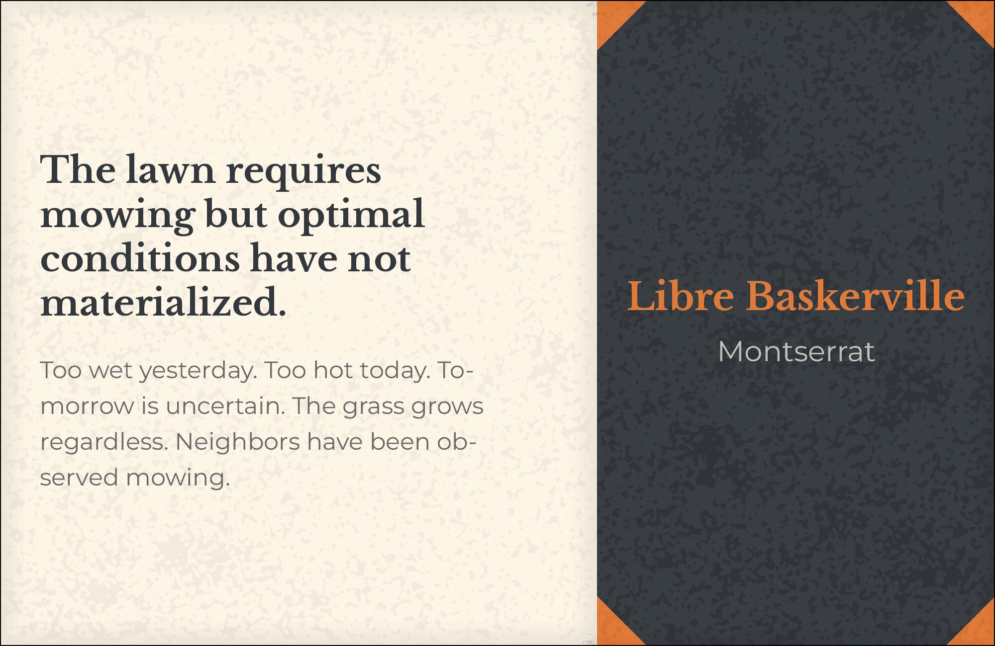 Arial’s open-source cousin provides reliable body text beneath Libre Baskerville’s elegant display headlines. Arimo‘s familiar letterforms ensure instant readability, while the refined serif adds typographic distinction. The contrast between utilitarian sans and classical serif creates subtle sophistication without pretension. Use this for practical applications requiring a touch of refinement.