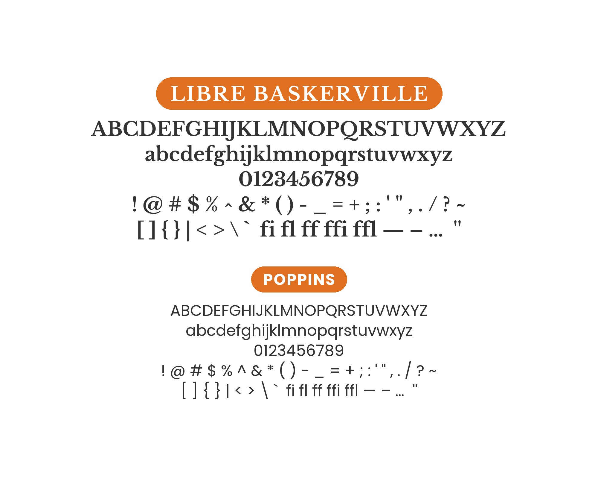 Geometric modernity meets transitional classicism. Poppins‘ perfectly circular counters and even stroke weights create contemporary headlines that contrast dramatically with Libre Baskerville’s calligraphic heritage. The tension between these aesthetics generates visual energy without discord. Perfect for creative agencies, design studios, or brands celebrating typographic range.