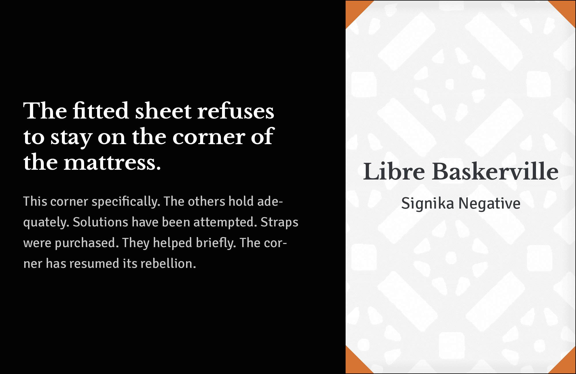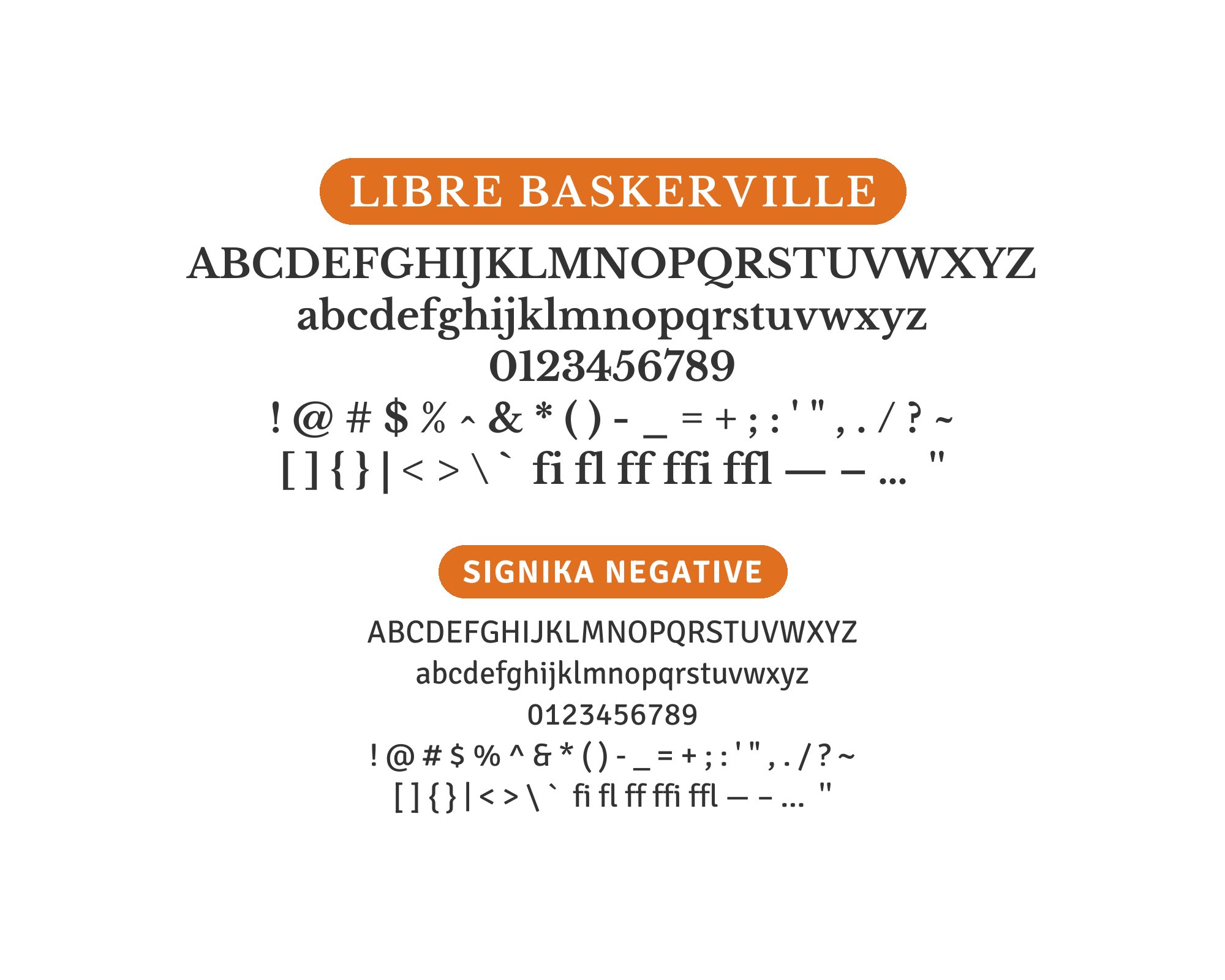 Signage-optimized clarity serves as an unexpected complement to classical serifs. Signika Negative‘s legibility-focused design creates punchy, readable body text while Libre Baskerville brings refined elegance to headlines. The reversal of typical serif-for-body conventions creates interesting visual dynamics. Use this for environmental design, wayfinding systems, or unconventional editorial layouts.
