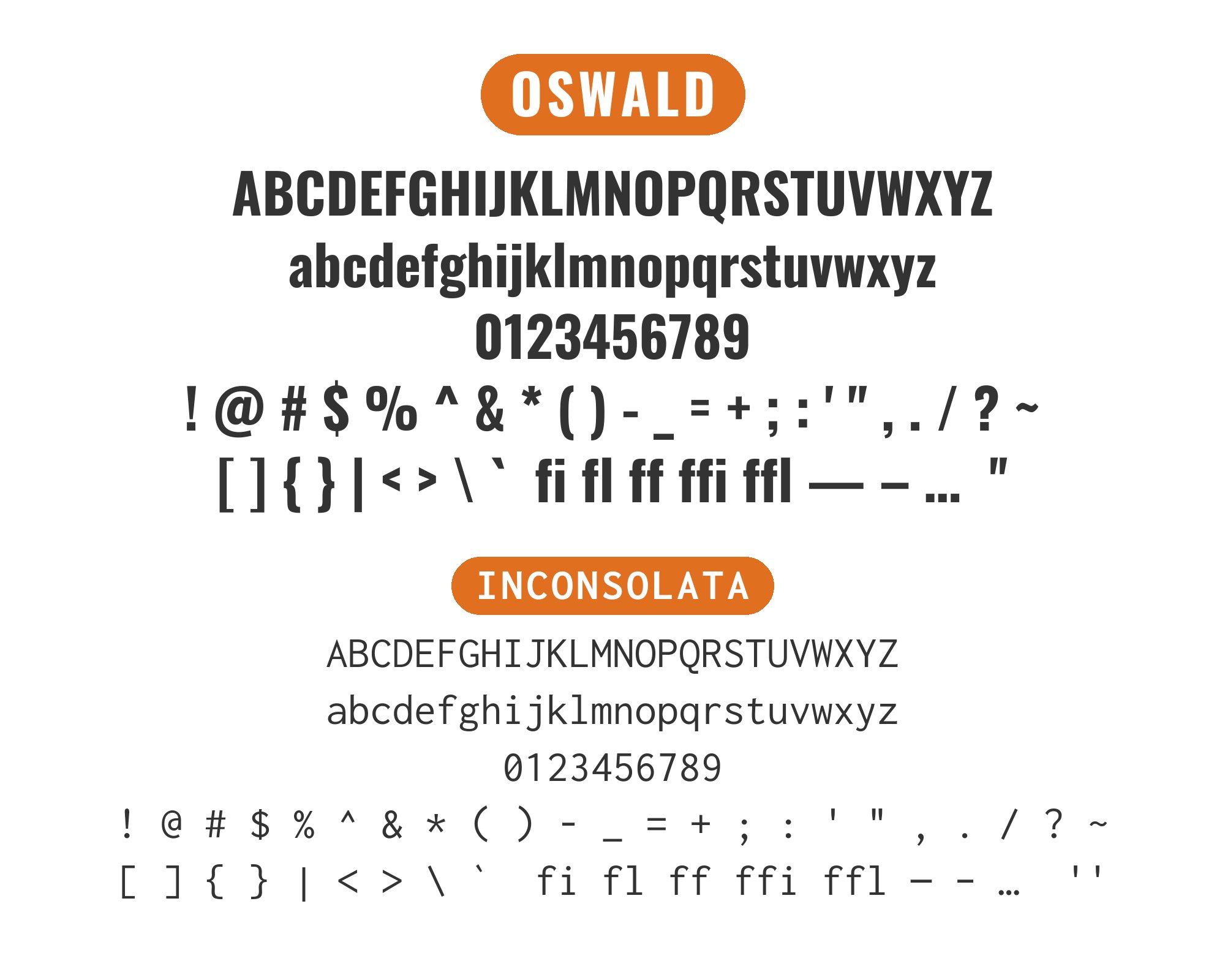 Monospace meets condensed sans in this surprisingly effective technical pairing. Inconsolata‘s even letterforms and programming-friendly design bring systematic clarity to code blocks and technical content, while Oswald provides punchy section headers. The combination suggests efficiency and precision. Perfect for developer documentation, tech blogs, or any context where code and prose must coexist elegantly.