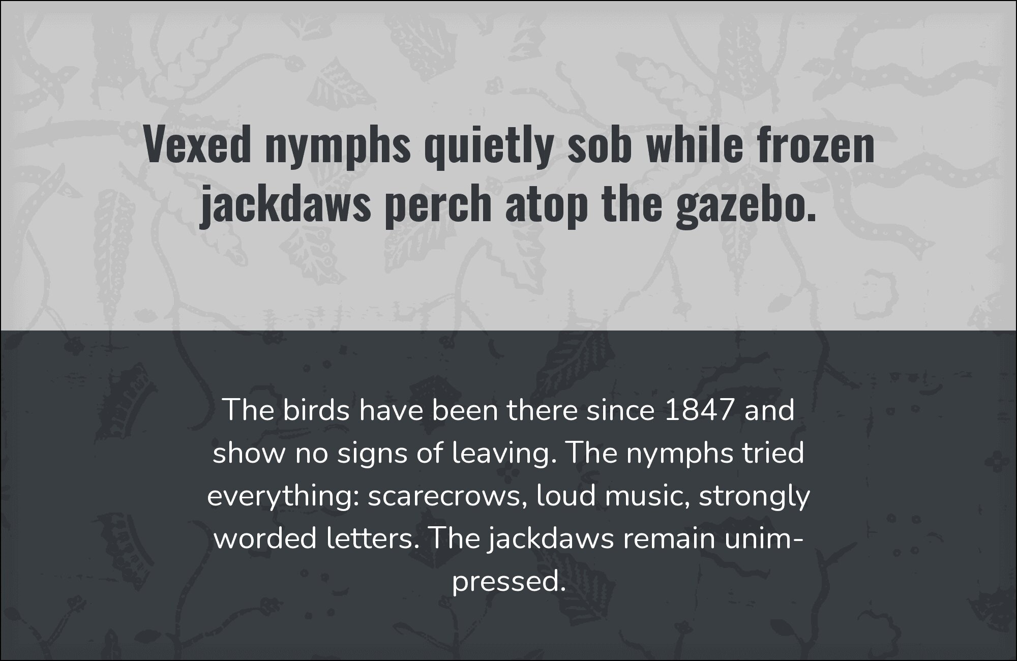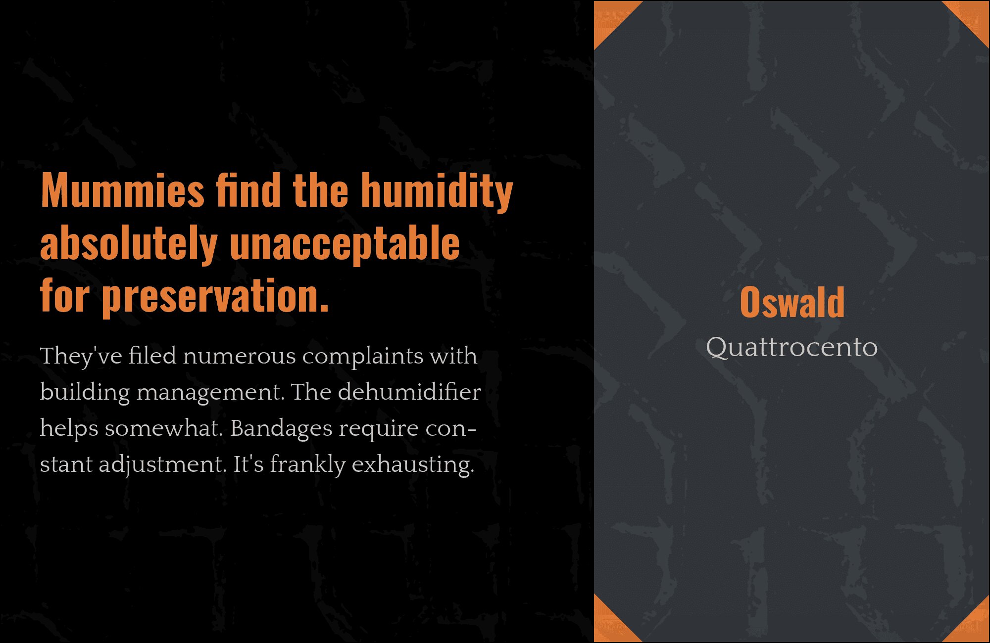 Classical meets contemporary in this unexpected alliance. Quattrocento‘s Renaissance-inspired serifs and calligraphic stroke modulation create sophisticated contrast against Oswald’s modernist compression. The pairing suggests a cultural institution that knows its history but lives in the present. Perfect for museum websites, architectural firms, or luxury brands that want heritage without stuffiness.