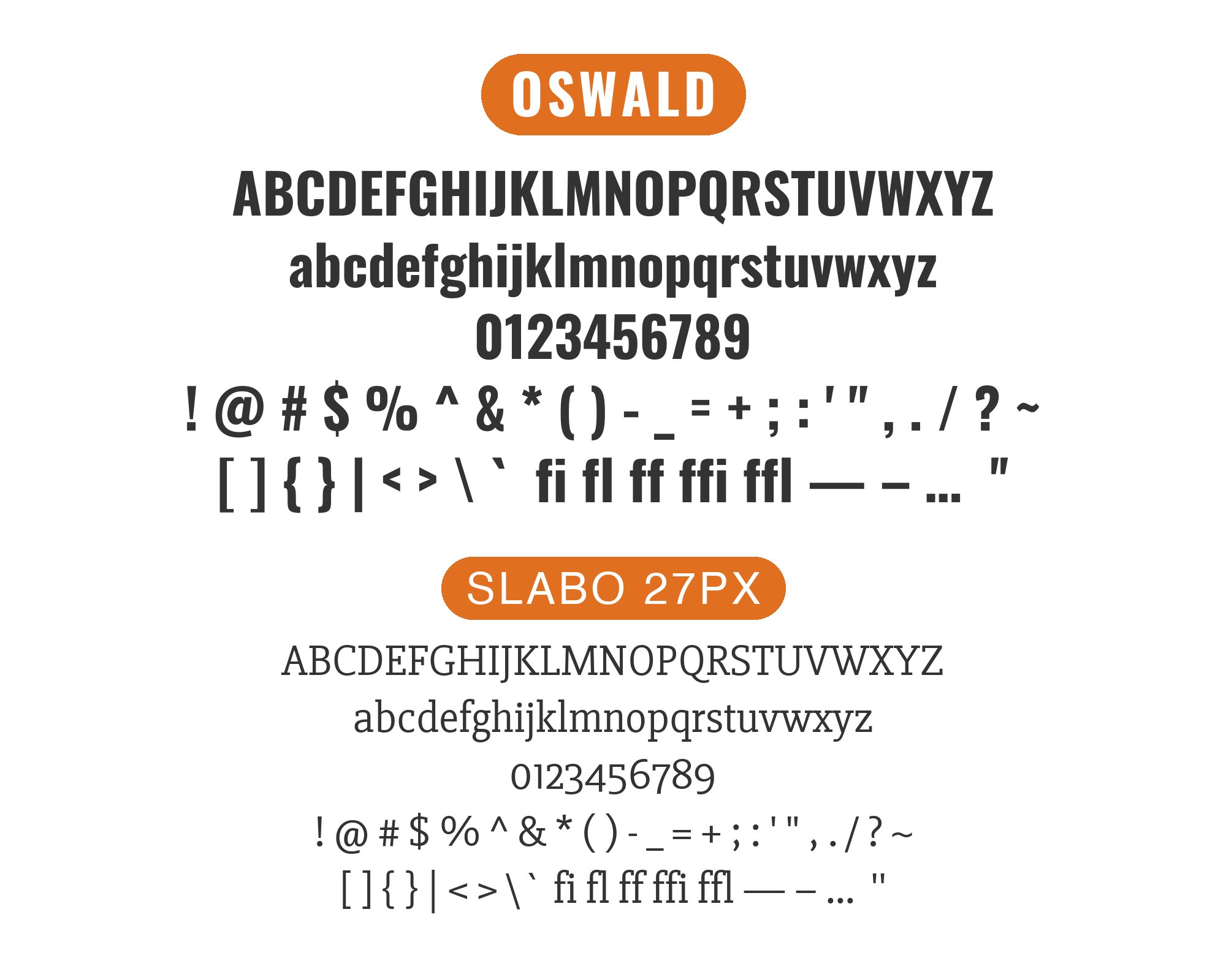 Slab serif swagger meets condensed sans power. Slabo‘s sturdy rectangular serifs create visual weight that echoes Oswald’s boldness while offering textural contrast. The chunky, confident personality of both fonts creates a cohesive voice with enough variation to establish hierarchy. This pairing works for craft breweries, construction companies, or any brand that wants to project solidity and strength.