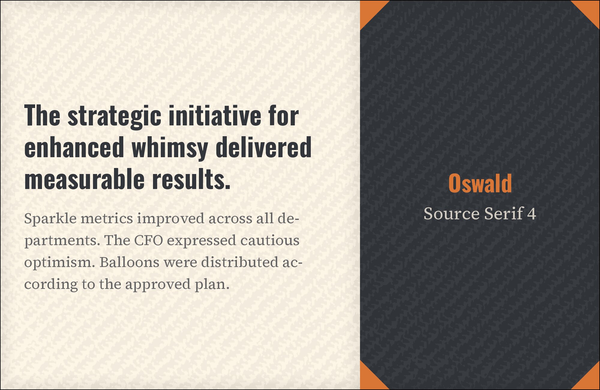 This pairing is a masterclass in typographic contrast. Oswald’s compressed letterforms snap with headline urgency while Source Serif 4 unfolds gracefully below, its refined bracketed serifs lending scholarly gravitas. The weight differential creates visual rhythm that guides the eye downward. Ideal for editorial layouts, longform journalism, or brand materials that need to balance authority with accessibility. Think newspaper broadsheets reimagined for digital screens.